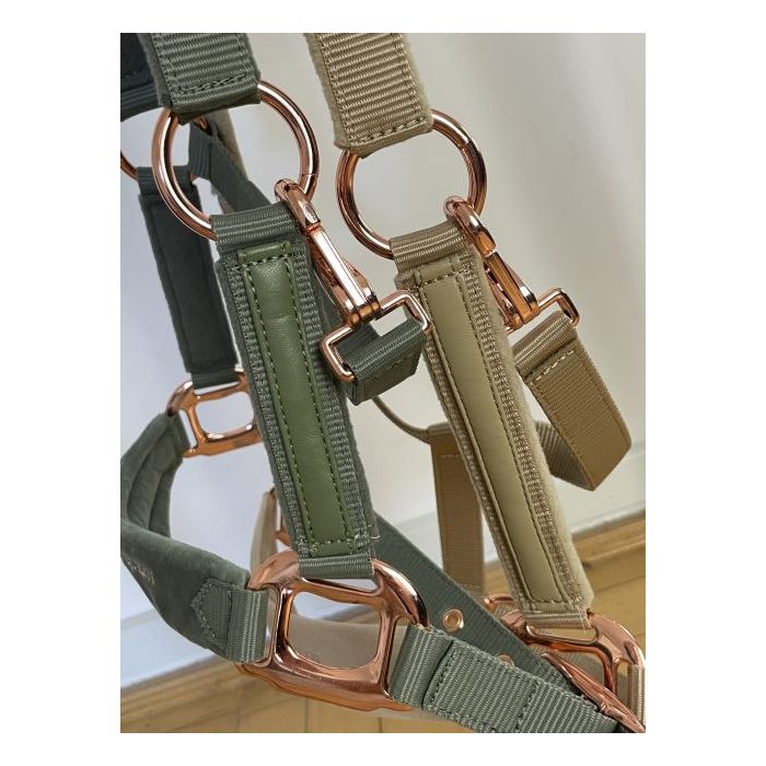 Klasyczny kantar - podszyty w miejscach narażonych na otarcia. Wykonany z wytrzymałej taśmy parcianej. Posiada wstawki ze sztucznej skóry na paskach bocznych. Zdobiony haftem EQ na nachrapniku. Dodatkowo piękne okucia w odcieniu rosegold.